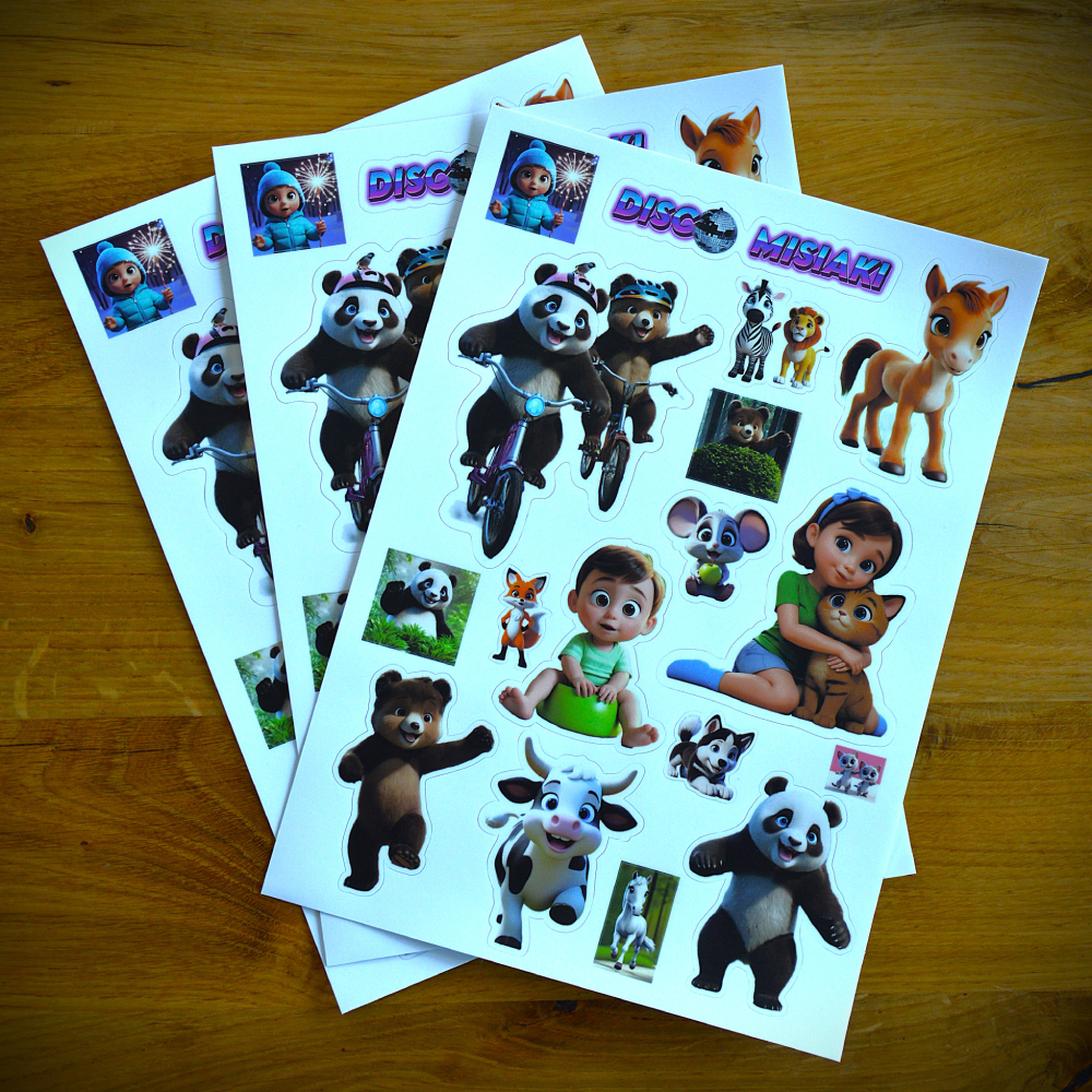 Zestaw 17 naklejek na kartce w formacie A4. Naklejki przedstawiają Disco Misiaki oraz ich przyjaciół z Waszych ulubionych piosenek.